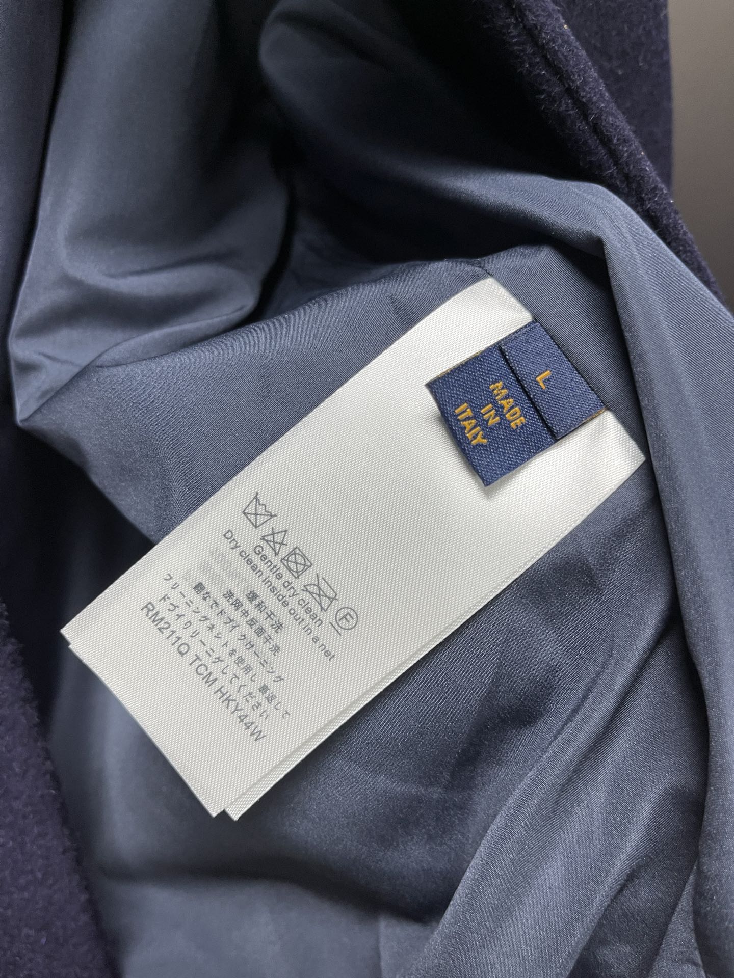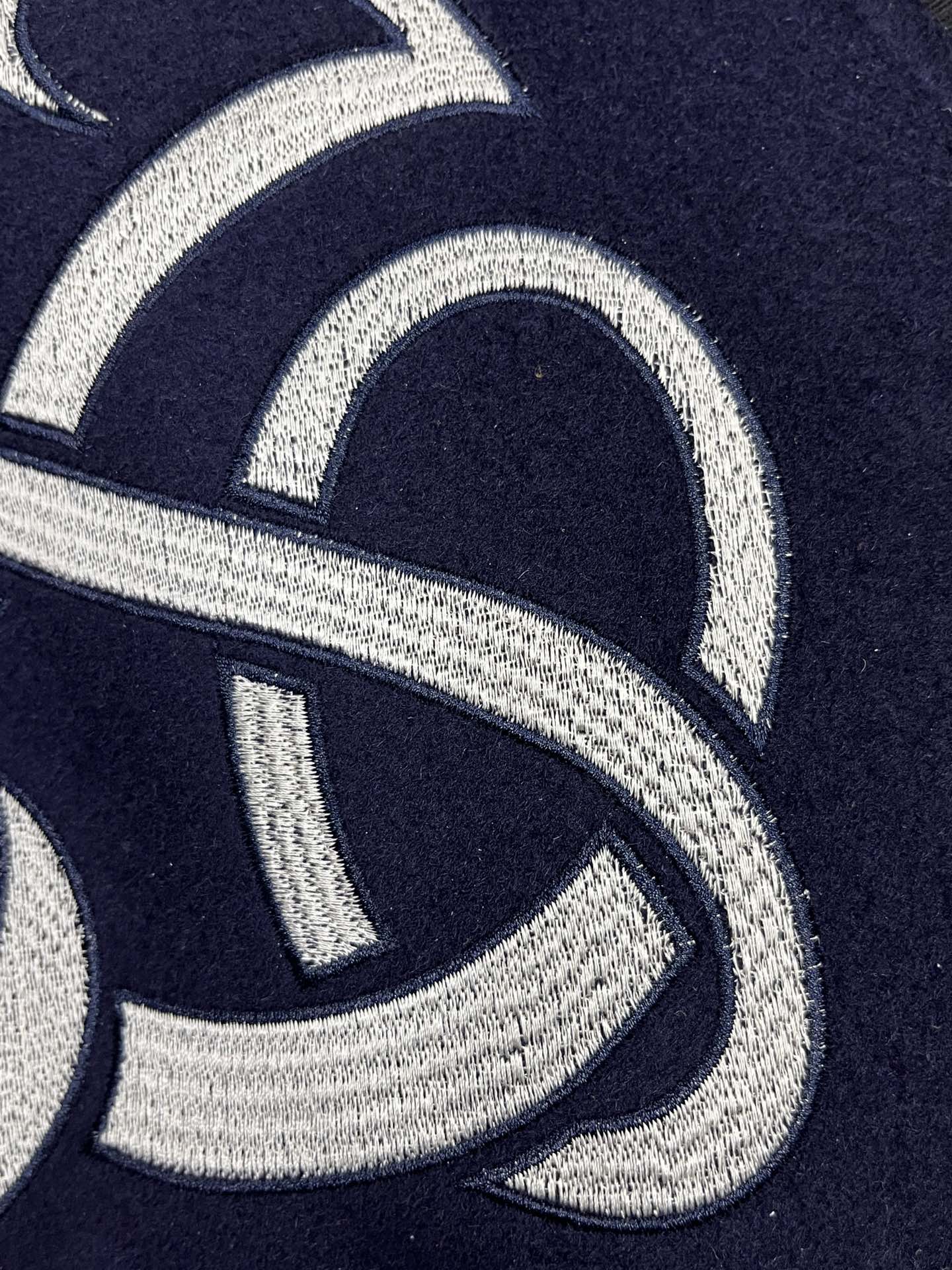 A coastal breeze meets collegiate cool. Deep-navy wool forms the body, while smooth white calfskin sleeves provide crisp contrast. LV Seashells embroidery puts a maritime spin on tradition: a retro Louis Vuitton script and delicate shell motif sit on the chest, while the back showcases a bold LV styled like a sailor’s knot. Pearl-effect snap buttons finish the jacket with yacht-club polish, elevating an iconic varsity silhouette to port-of-call sophistication.