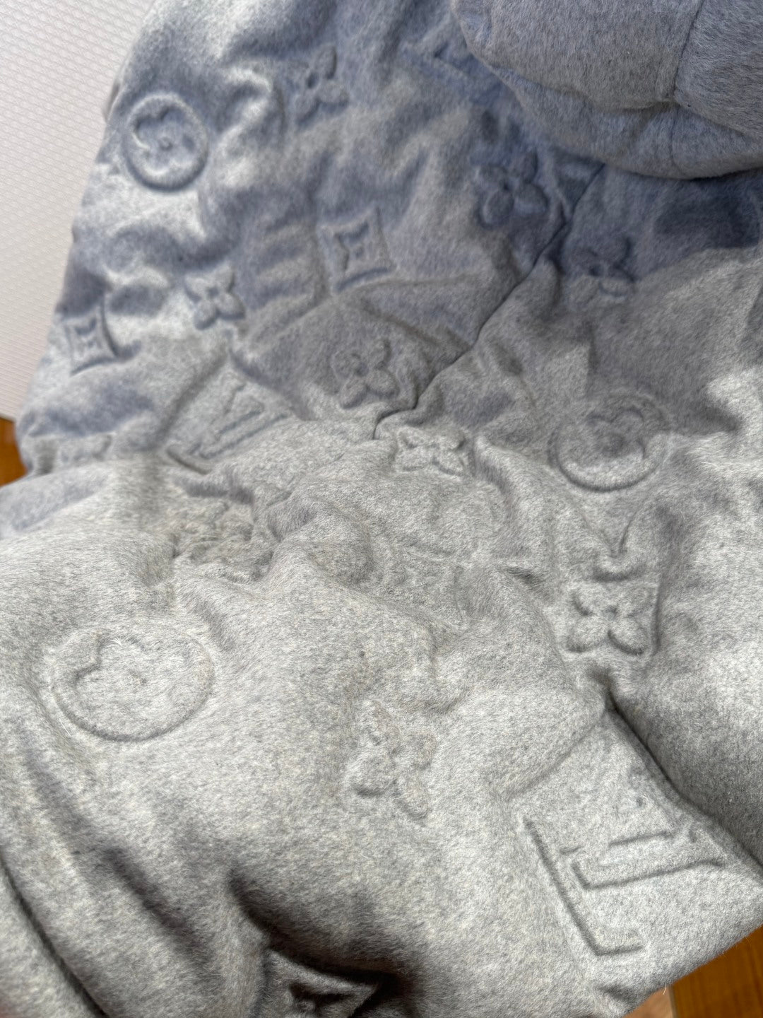 Selling out quick—add the Louis Vuitton Full-Print Embossed Gray Logo Down Jacket to your cart before the chill—and other collectors—sets in.