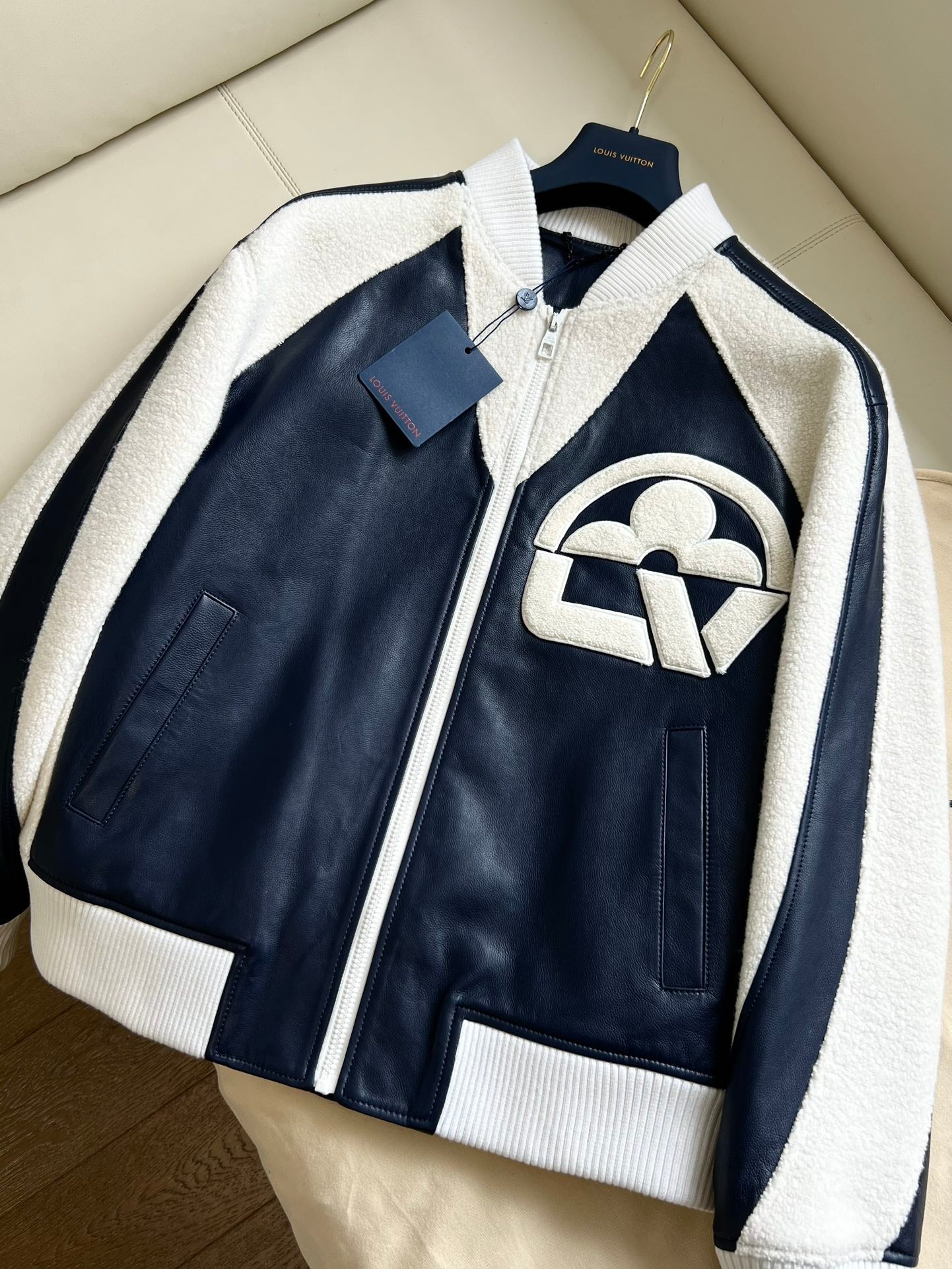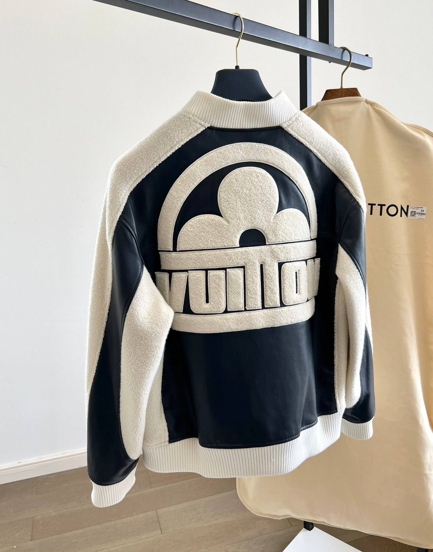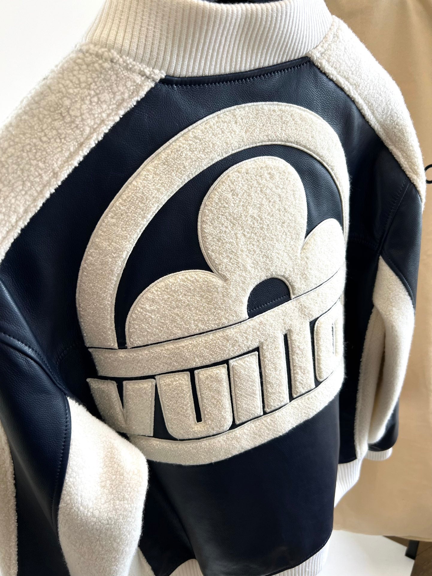 Motorsport attitude meets varsity nostalgia. Smooth dark-navy calfskin sets a sleek backdrop for curly white bouclé panels that pop like racing stripes. Oversized Vuitton Flower patches—loop-stitched in cloud-white wool—claim the chest and back, giving the piece its track-day energy. Finished with a ribbed bomber collar, cuffs, and hem plus a polished zip front, this teddy jacket turns a classic silhouette into the season’s most photogenic outer layer.