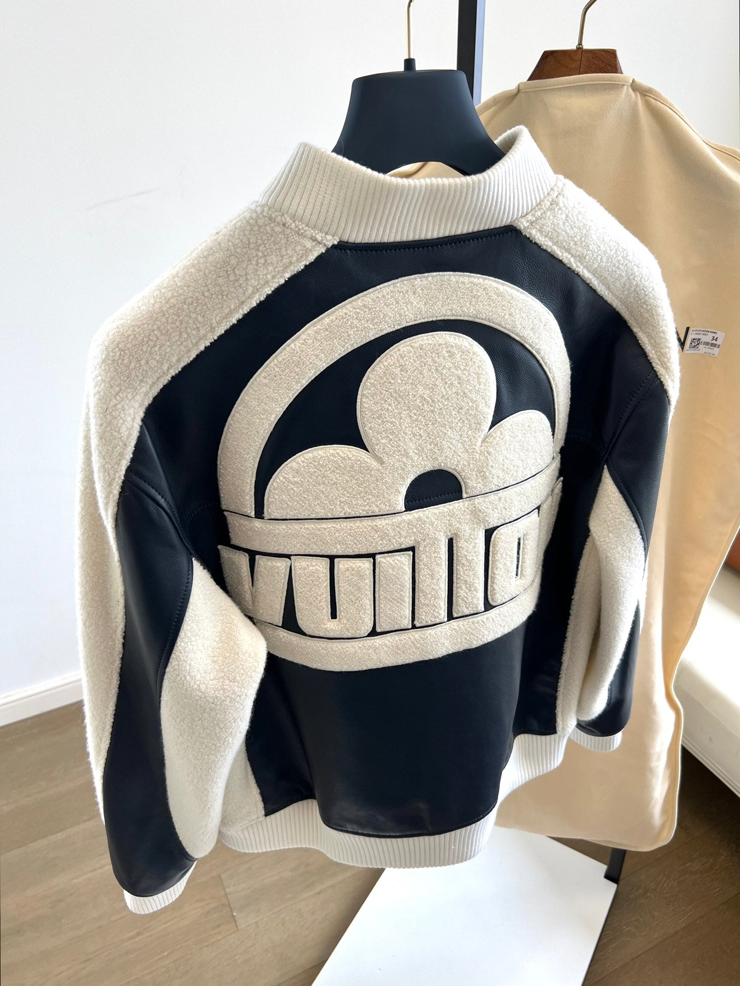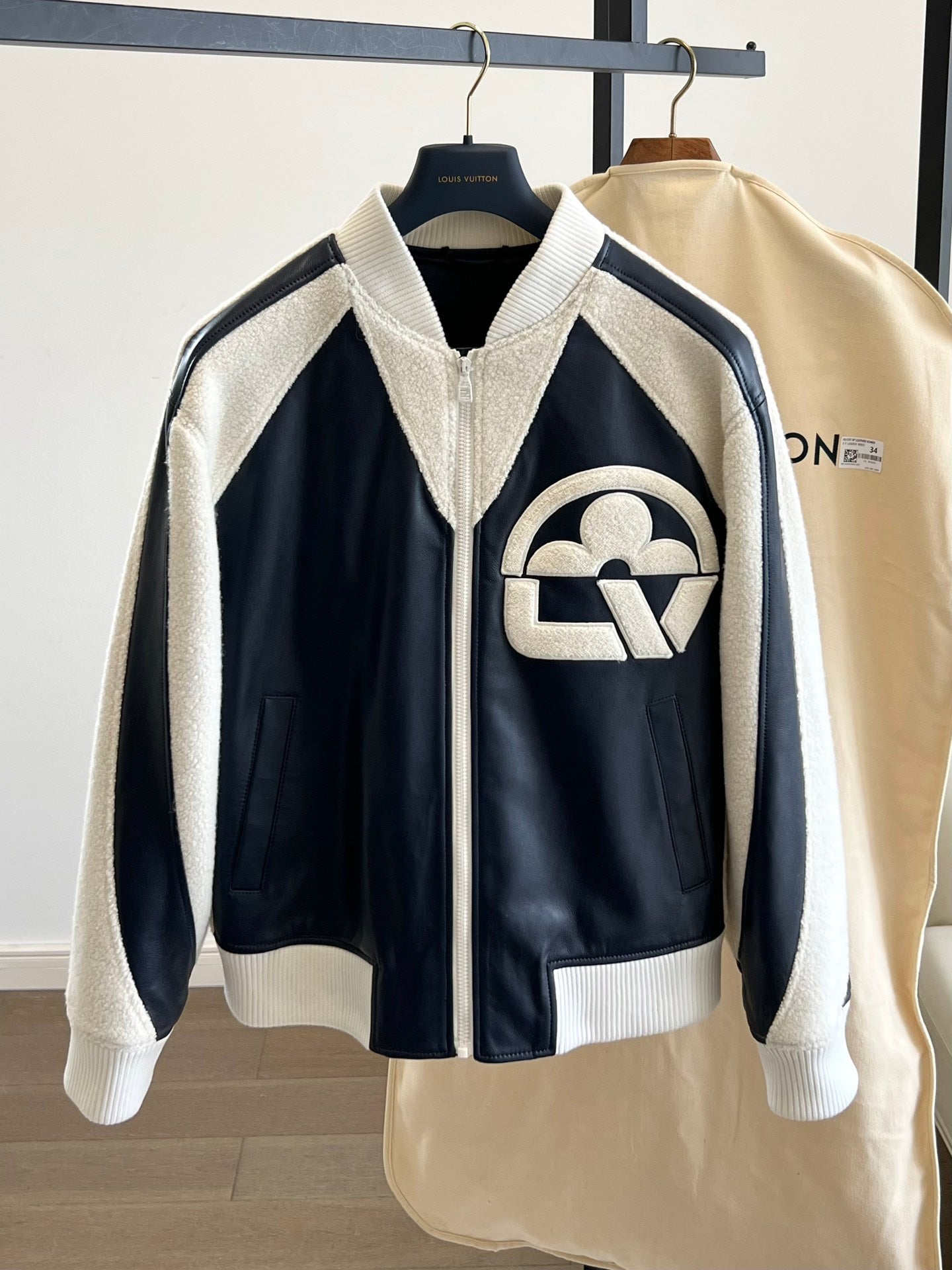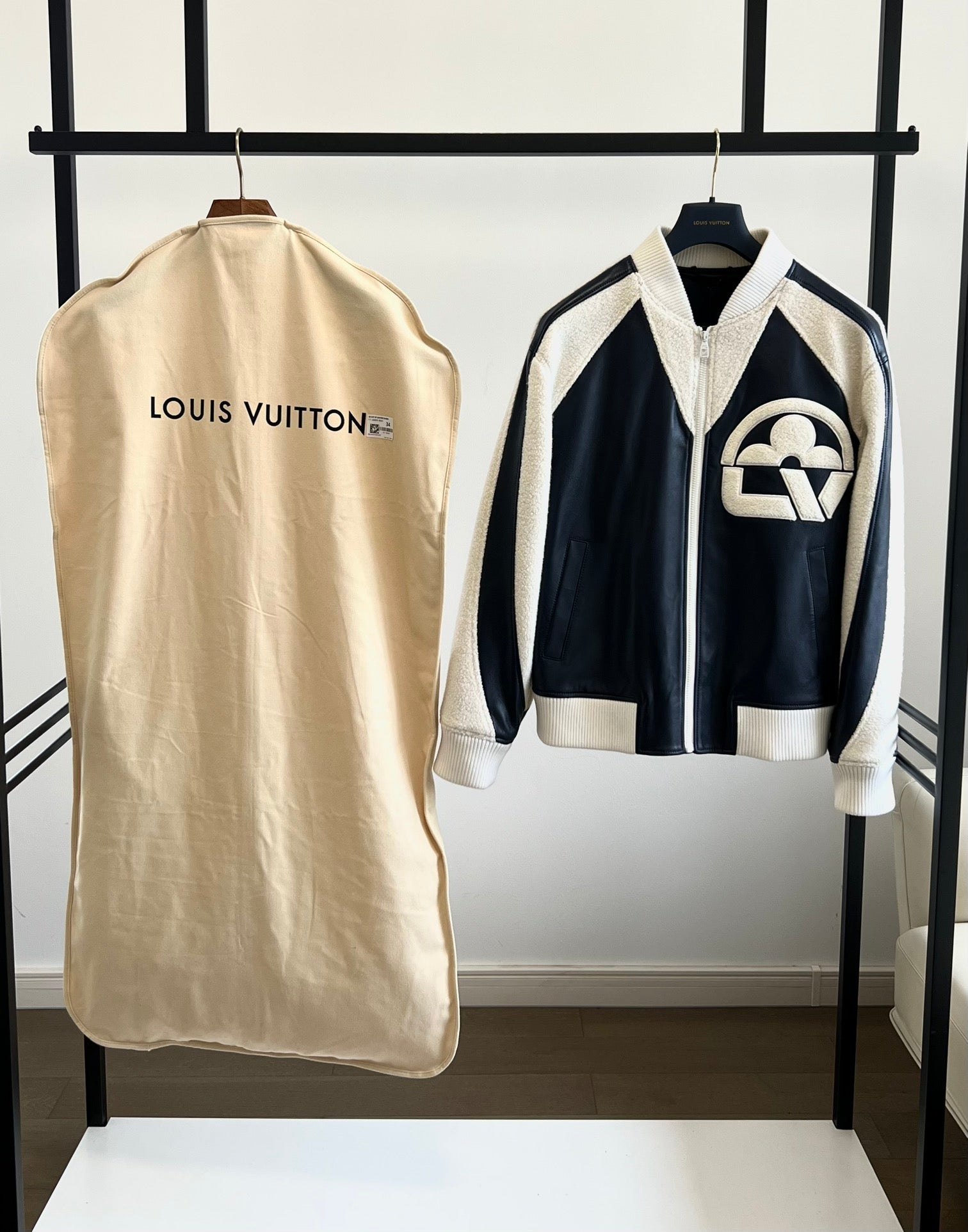 Motorsport attitude meets varsity nostalgia. Smooth dark-navy calfskin sets a sleek backdrop for curly white bouclé panels that pop like racing stripes. Oversized Vuitton Flower patches—loop-stitched in cloud-white wool—claim the chest and back, giving the piece its track-day energy. Finished with a ribbed bomber collar, cuffs, and hem plus a polished zip front, this teddy jacket turns a classic silhouette into the season’s most photogenic outer layer.